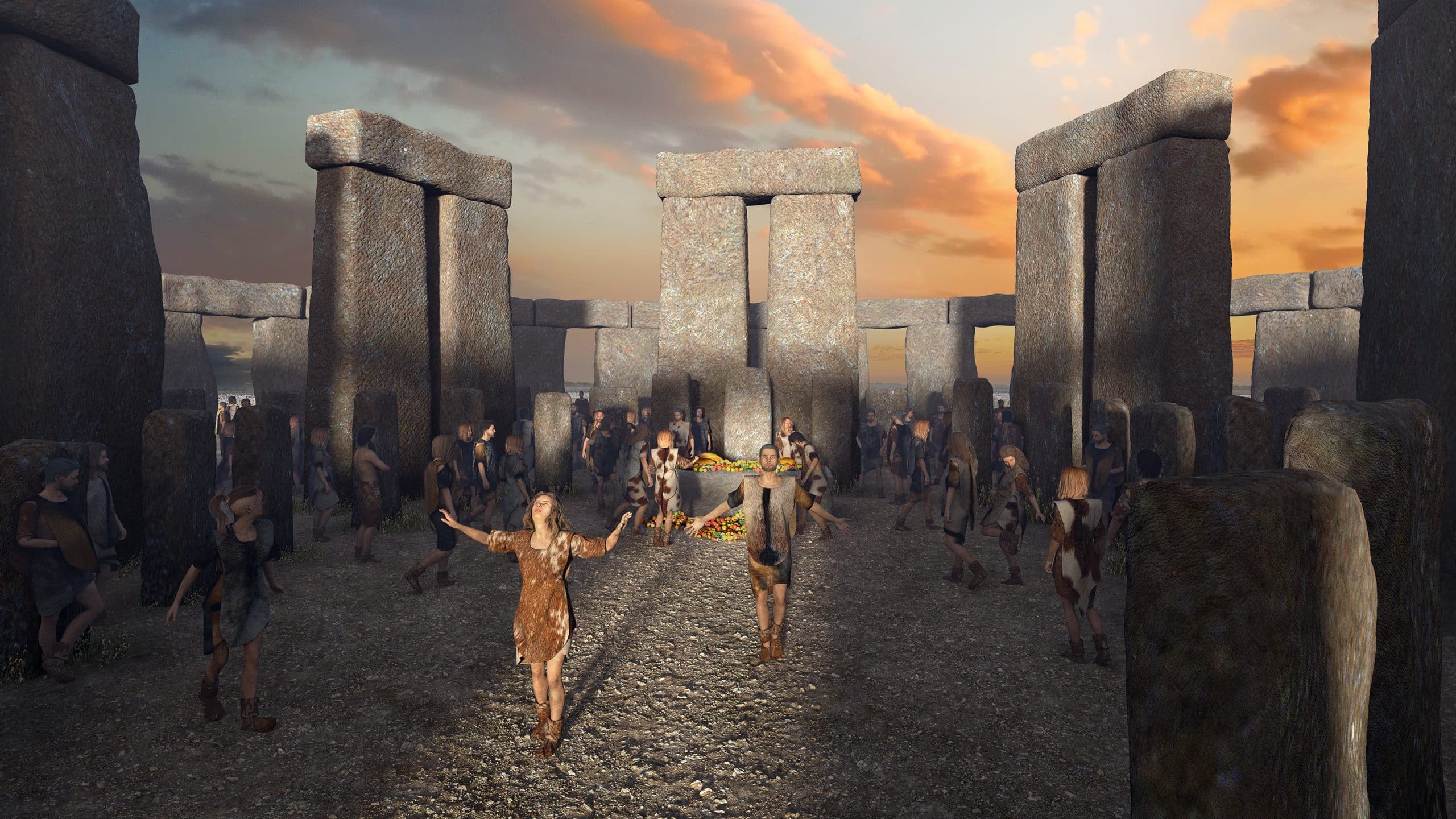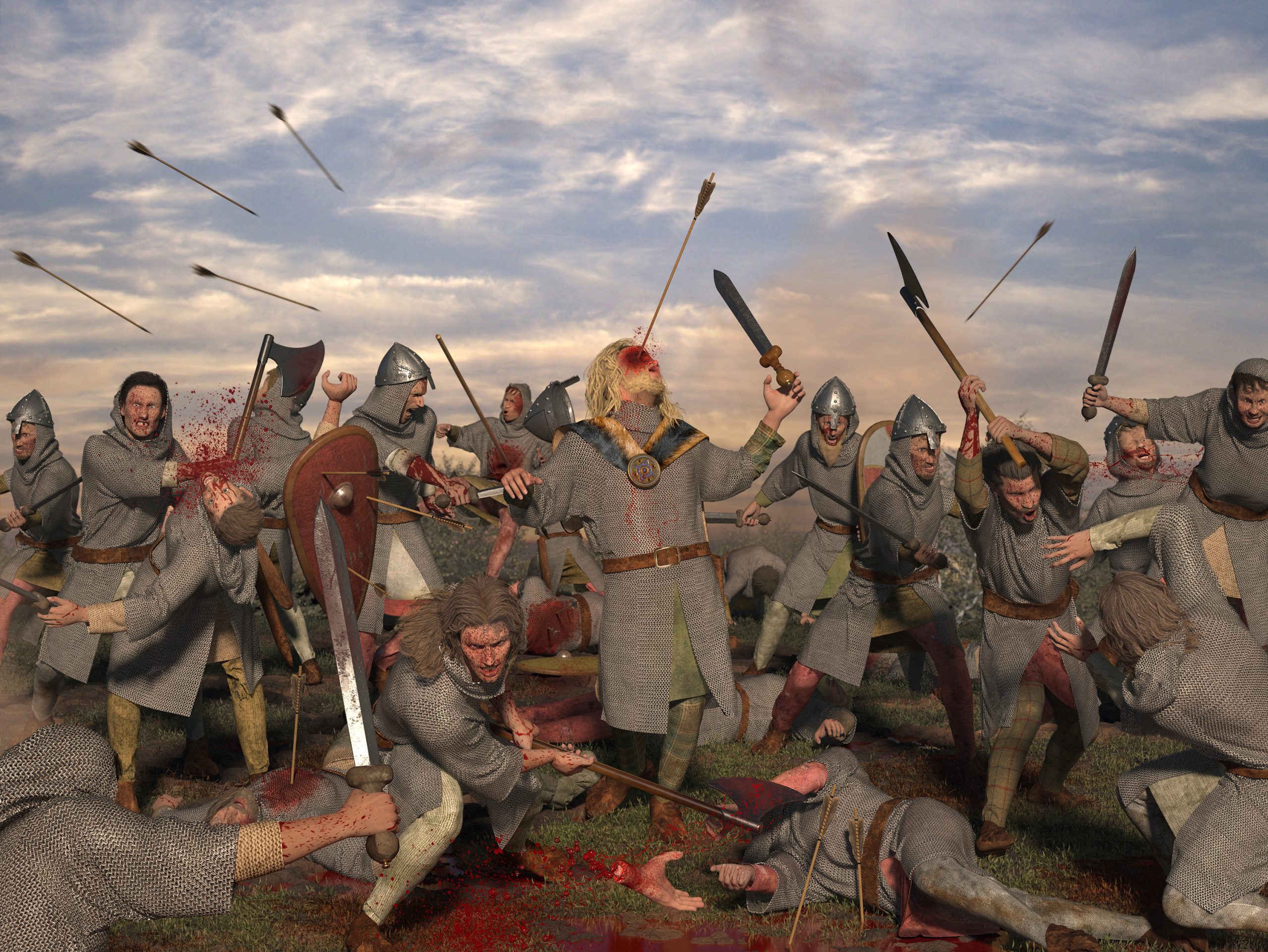 A rather gory scene depicting King Harold meeting his demise at the Batlle of Hastings in 1066 and a reconstruction of Stone Henge during the summer solstice.